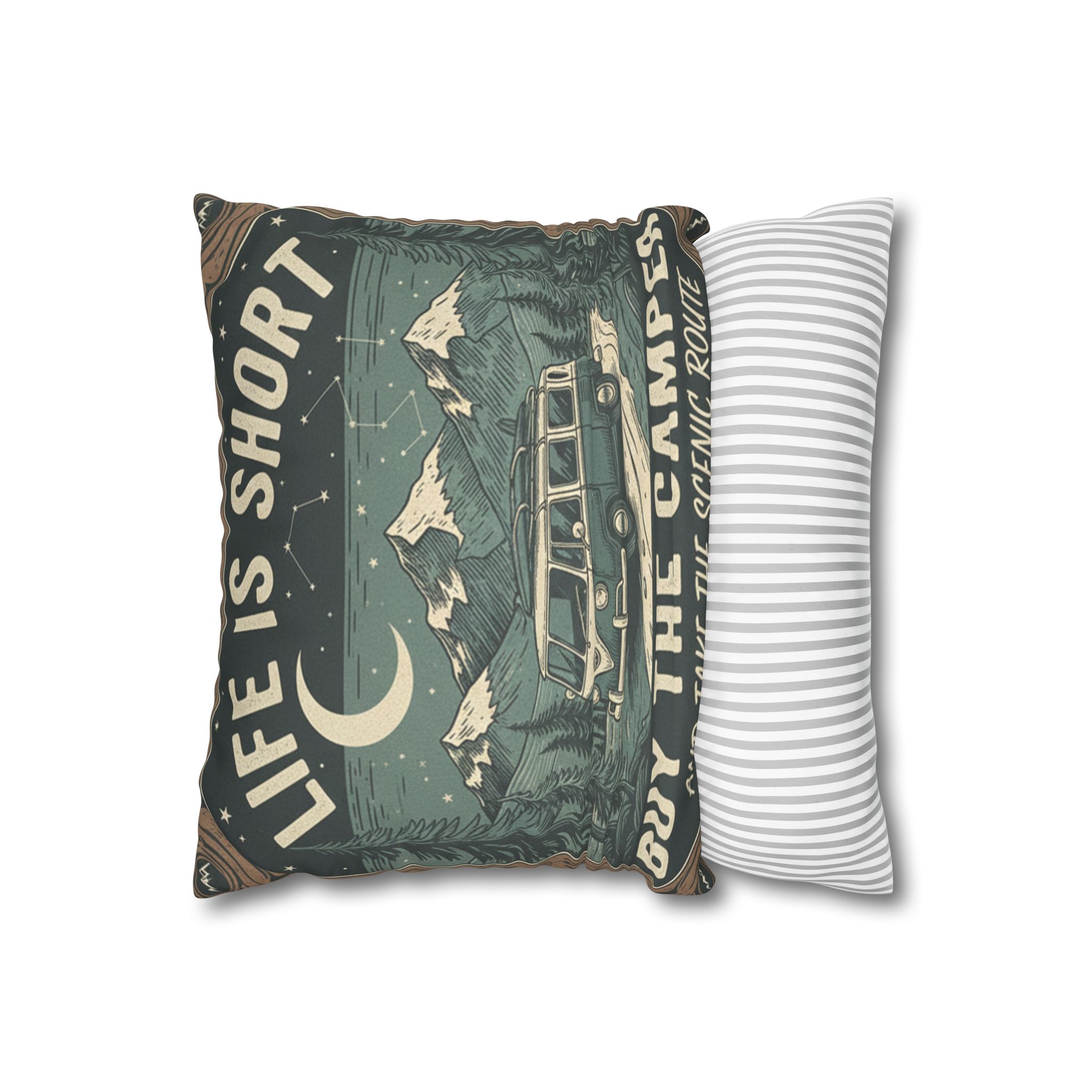 Pillowcase — “Life is short buy the camper and take the scenic route” Faux Suede Travel Throw Pillow Cover