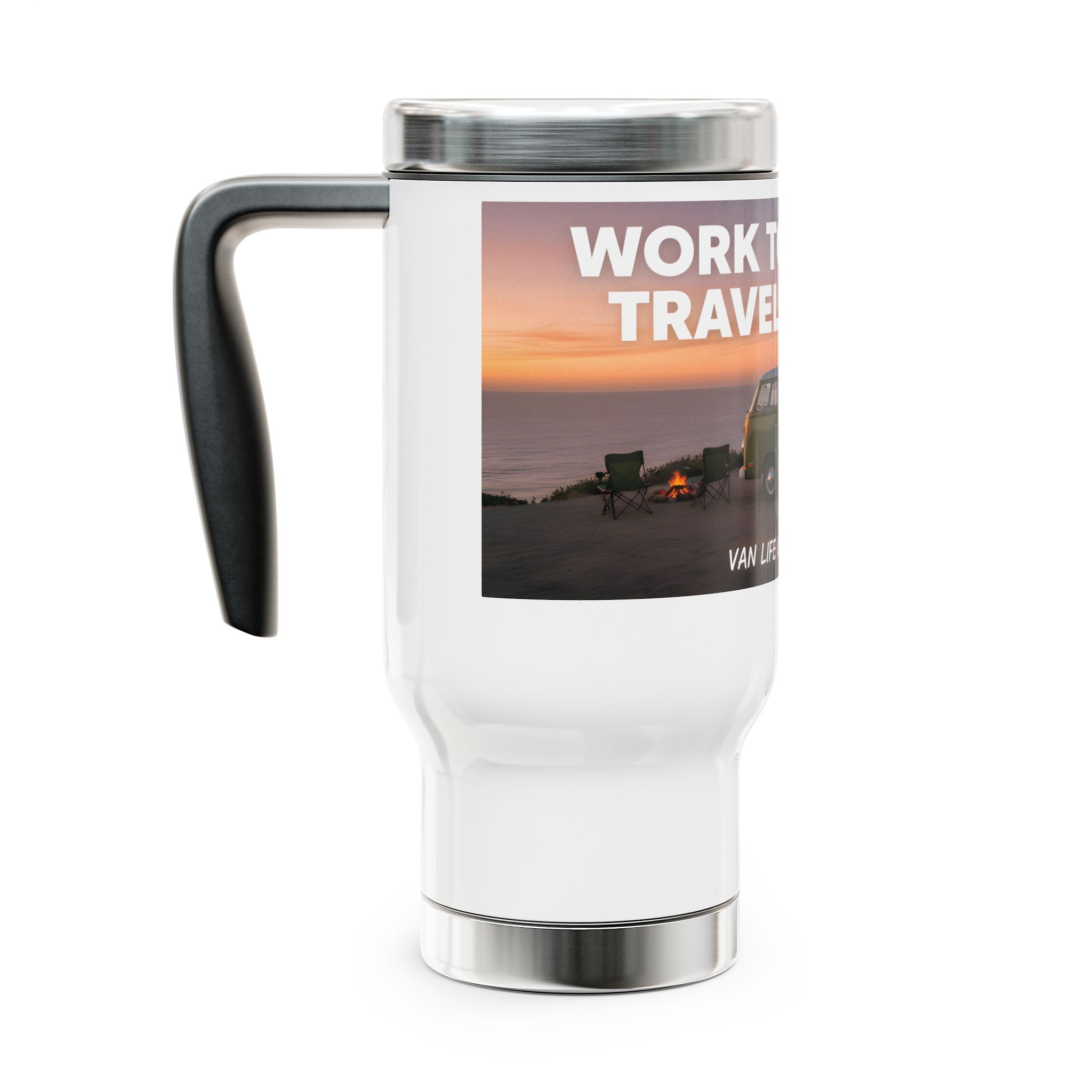 Stainless Steel Travel Mug with Handle, 14oz – “Work to Travel, Travel to Live”