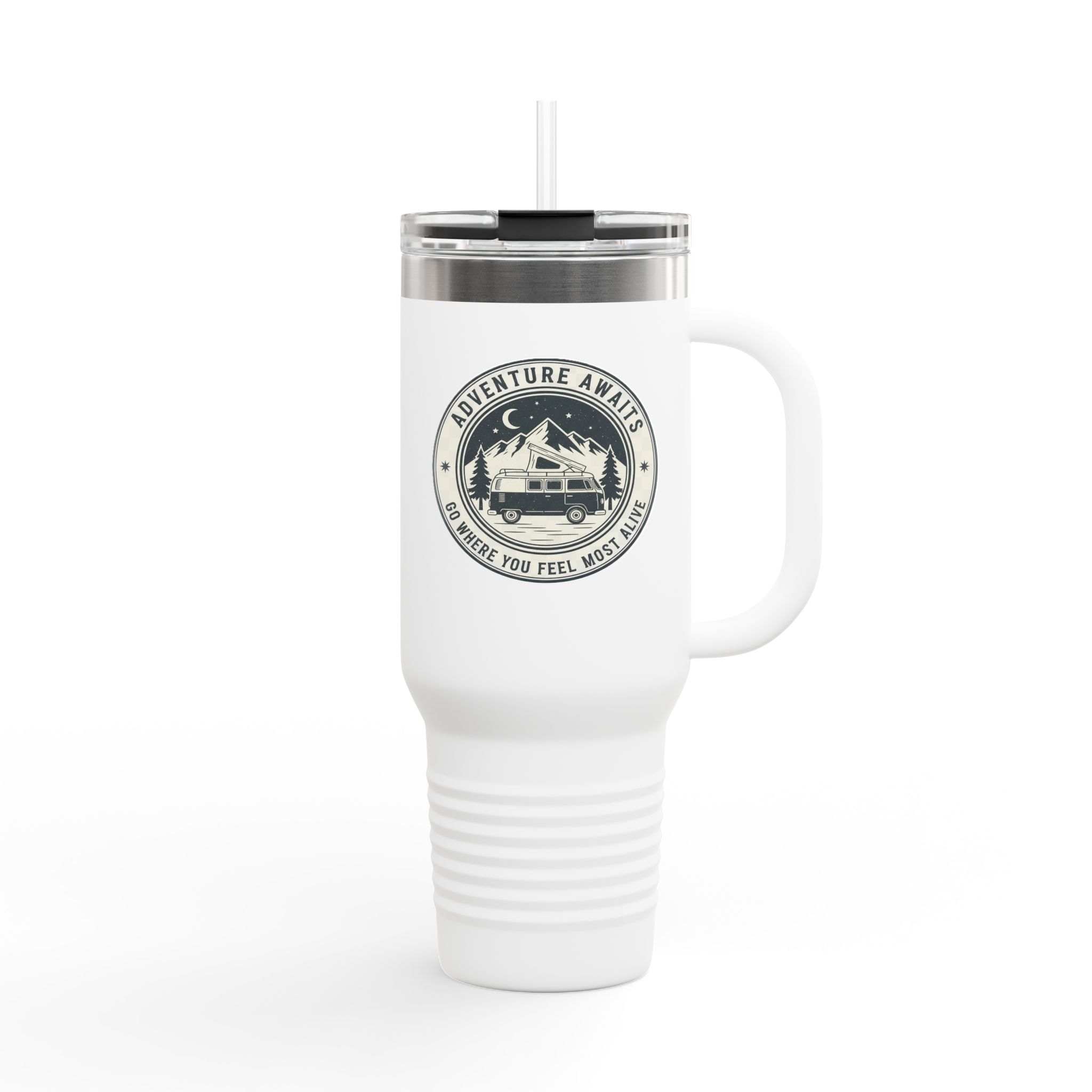 Insulated Travel Mug – “Adventure Awaits-Go Where You Feel Most Alive” (40oz) – Retro Camper Design, Keep Drinks Hot or Cold