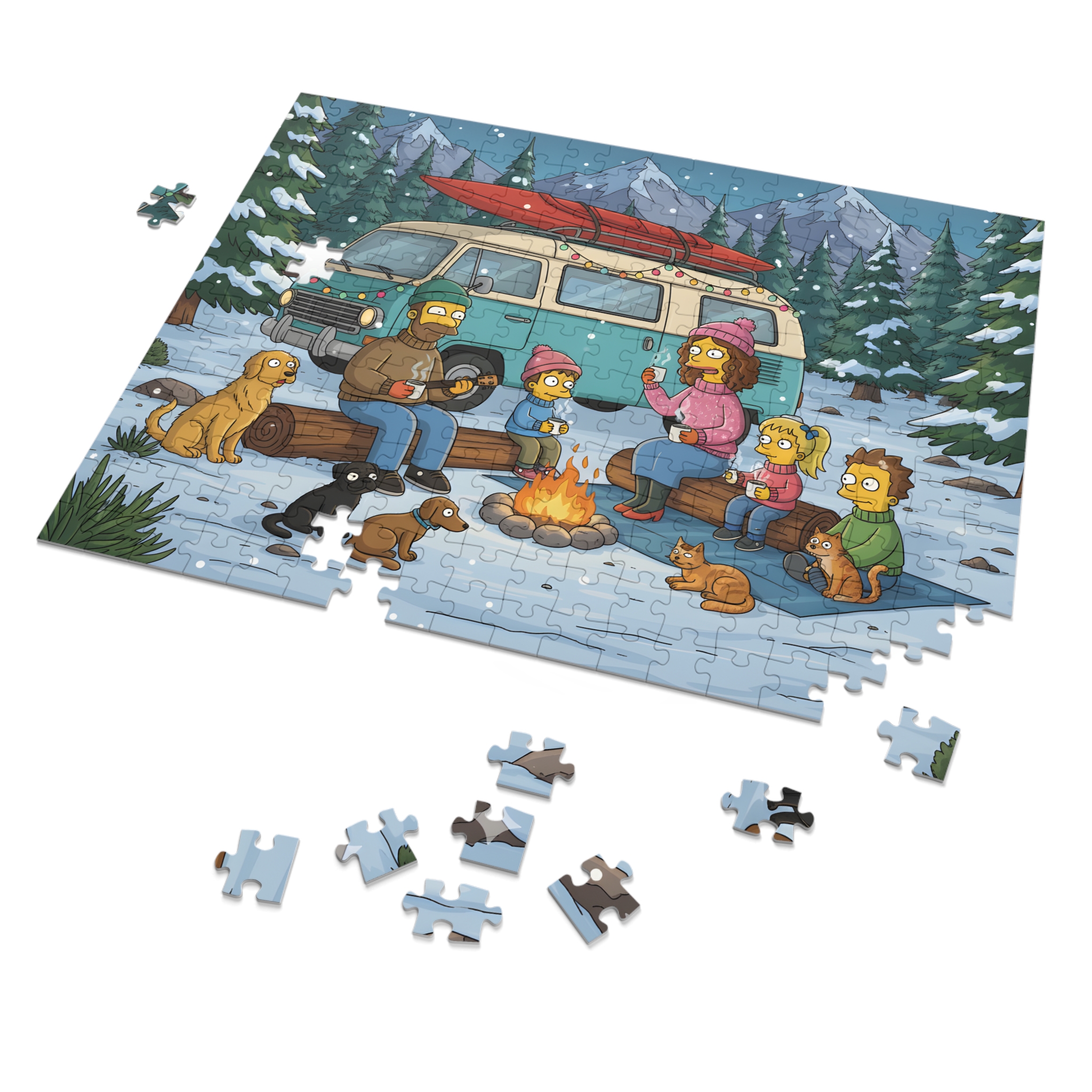 Jigsaw Puzzle with Tin — Cozy RV Winter Scene with Campfire