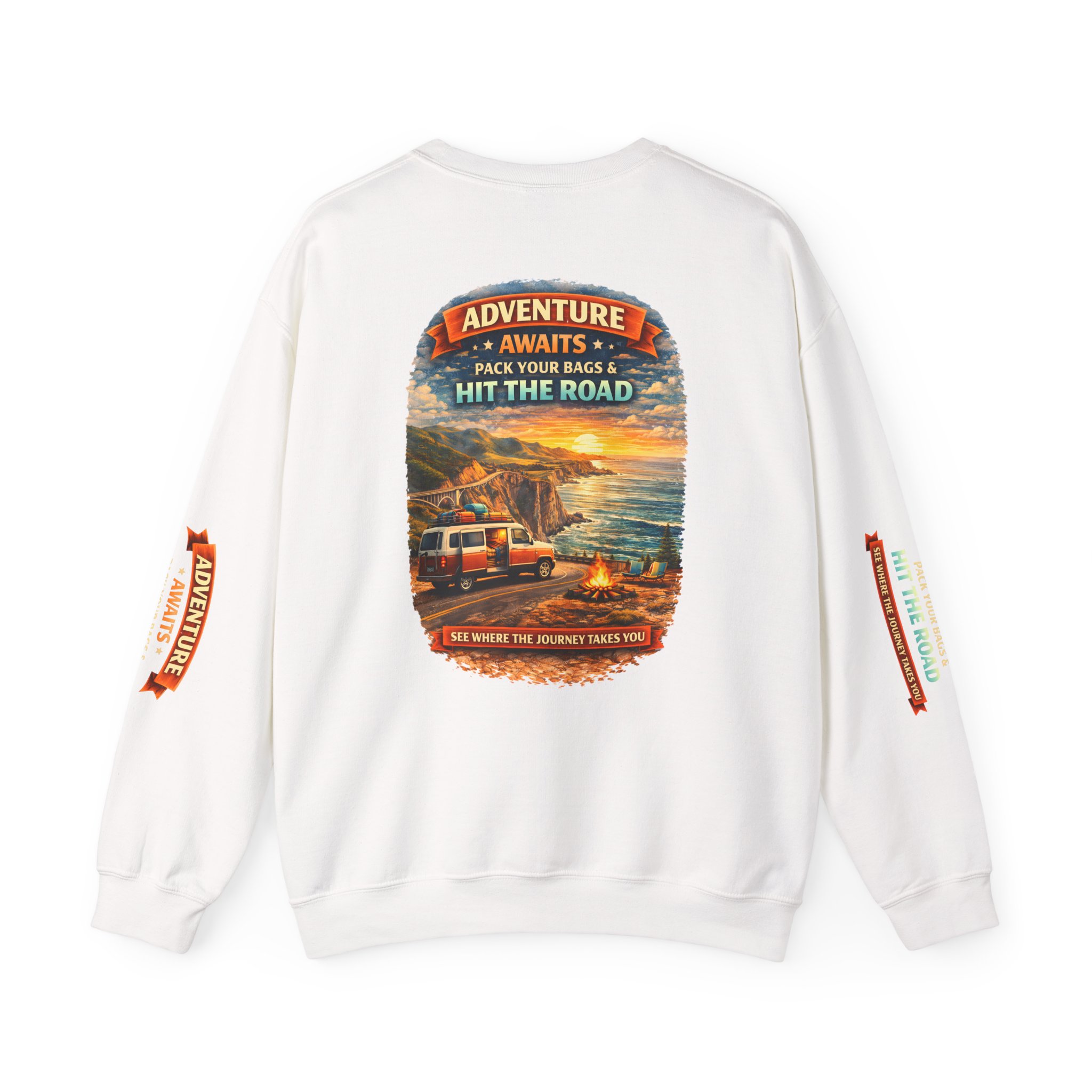 Unisex Heavy Blend™ Crewneck Sweatshirt — “Adventure Awaits,Pack Up The Van” Design Minimal-Line