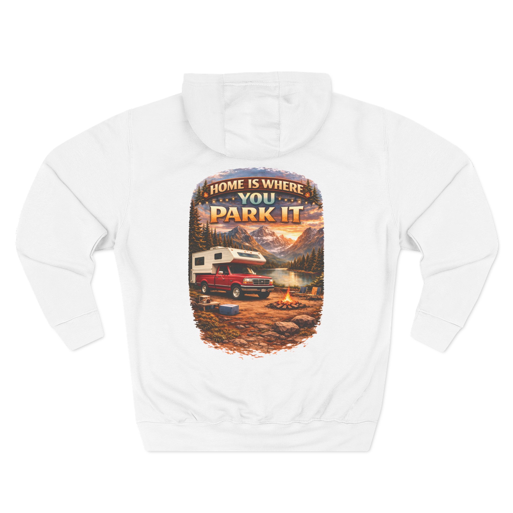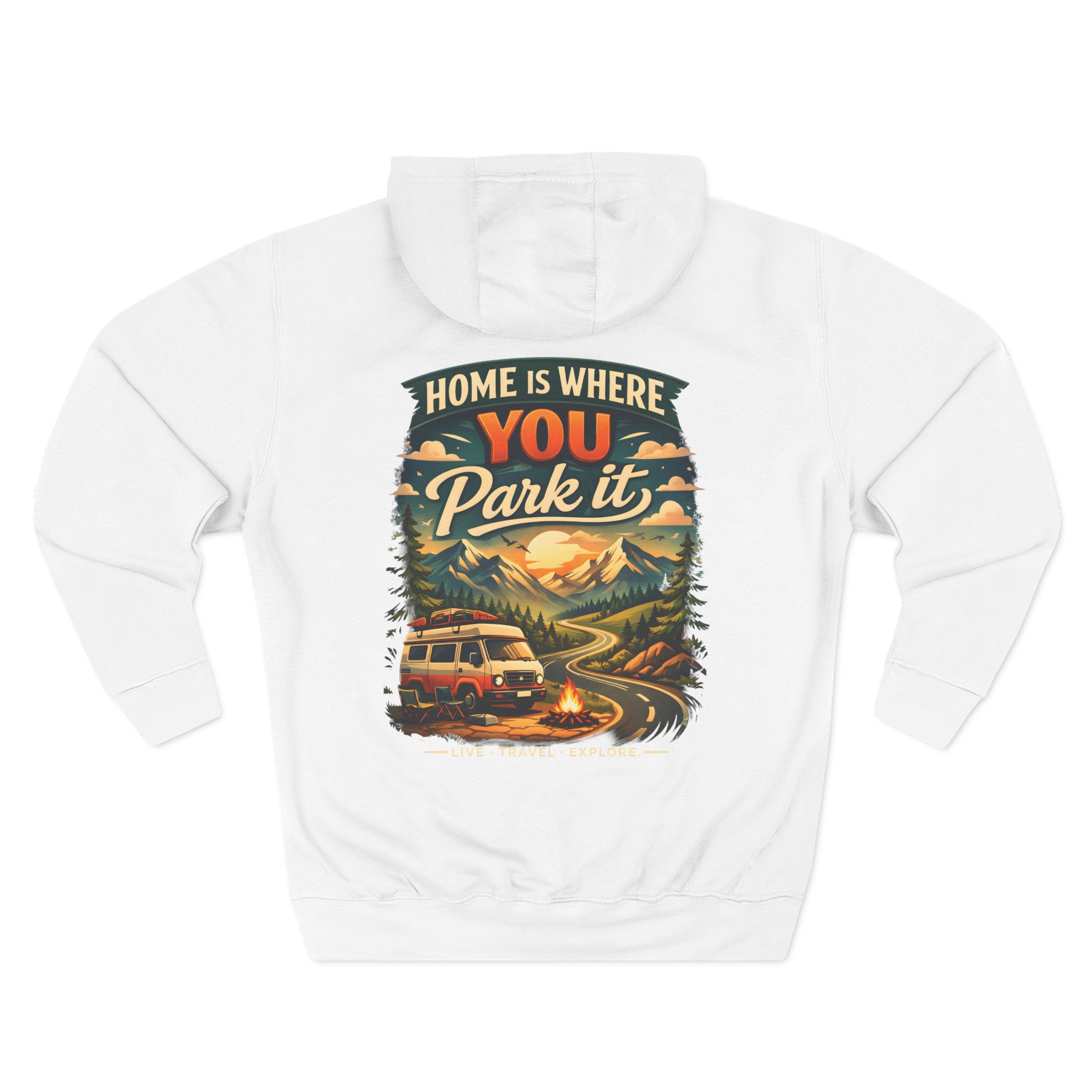 Three-Panel Fleece Hoodie – “Home Is Where You Park It” Design Minimal-Line