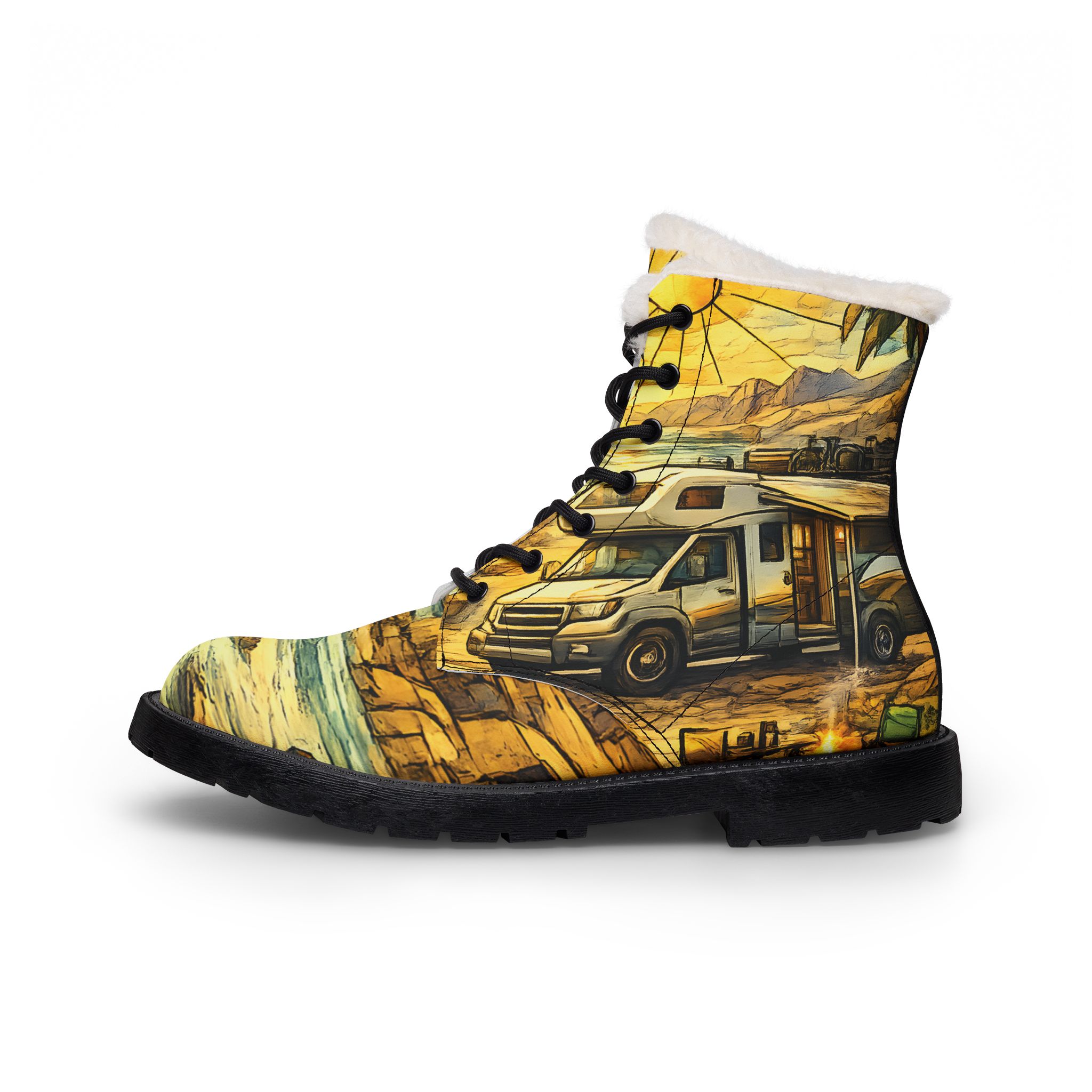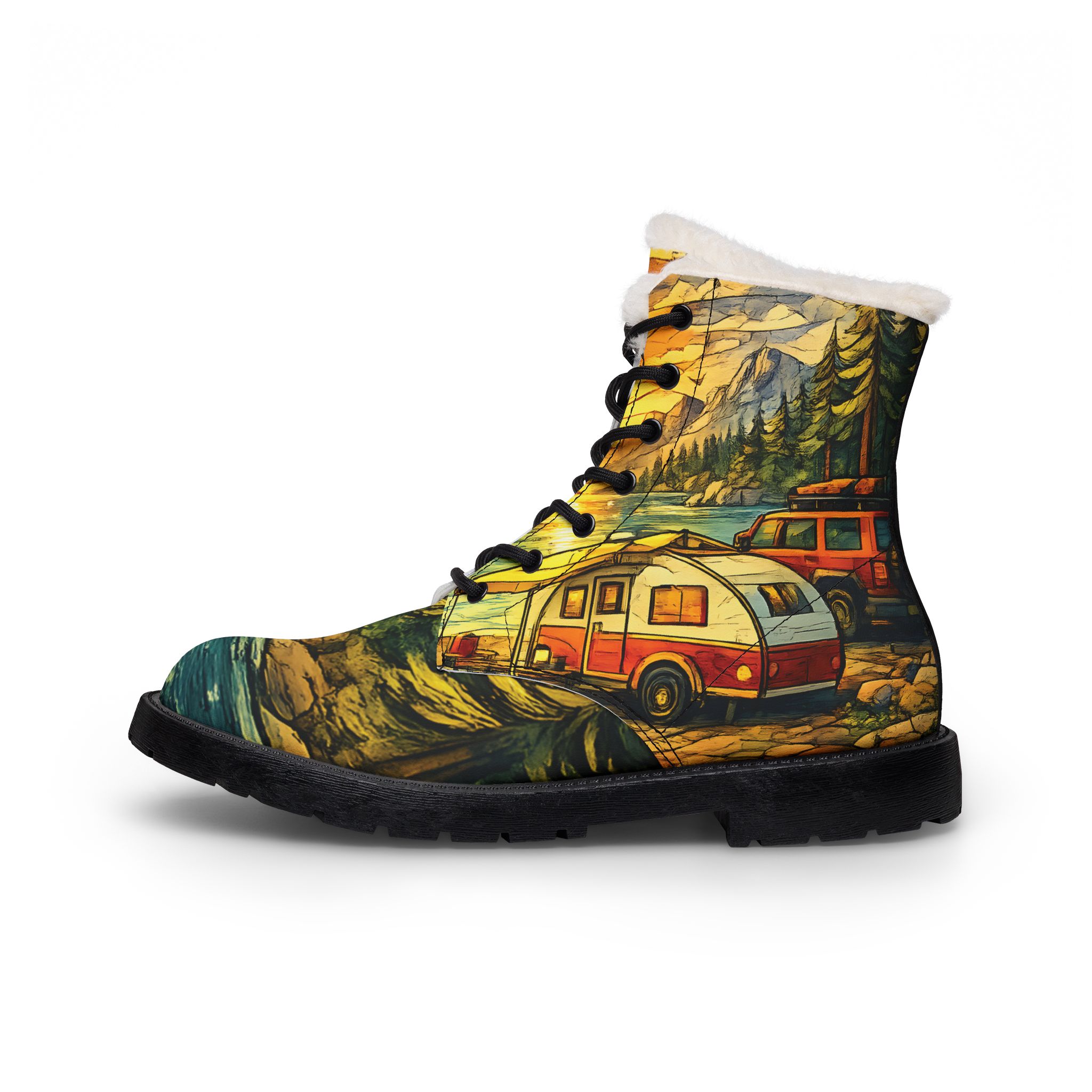 Men’s Fur and Leather Boots — Camper Van Wilderness Print (Cubic-Line)