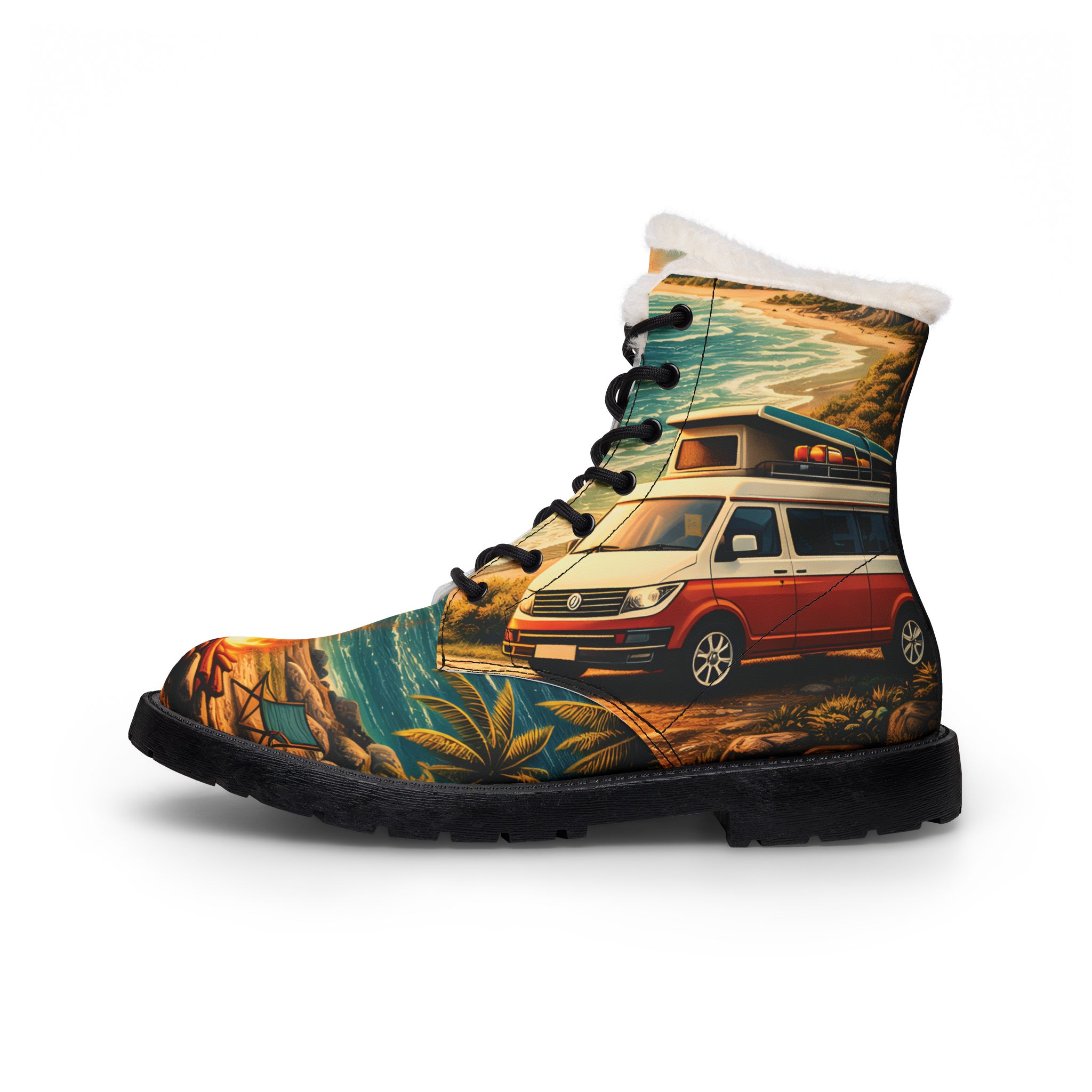 Men’s Fur and Leather Boots — Mercedes Vintage Camper Van Wilderness Print (Cubic-Line)