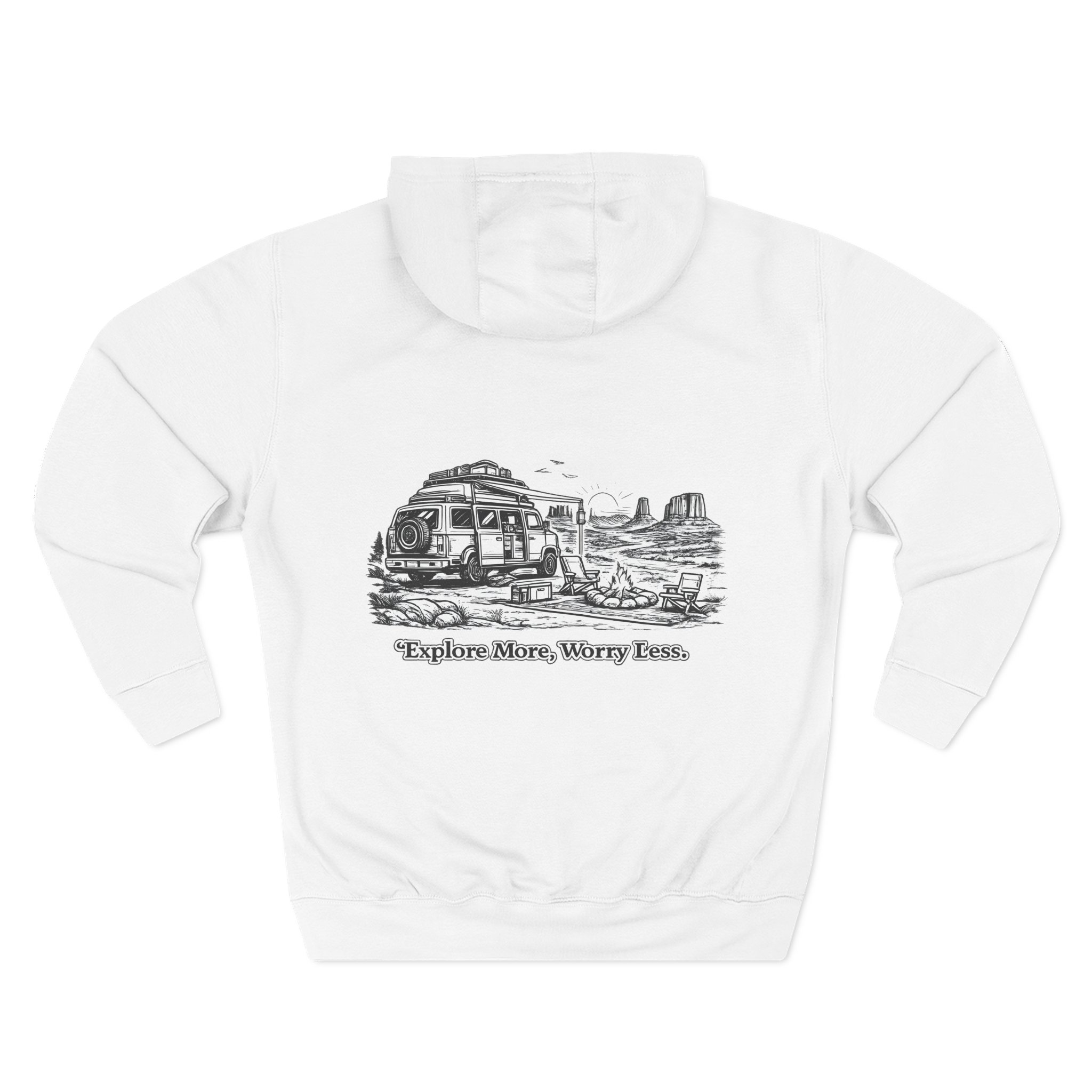 Three-Panel Fleece Hoodie – “Explore More Worry Less” Design Minimal-Line