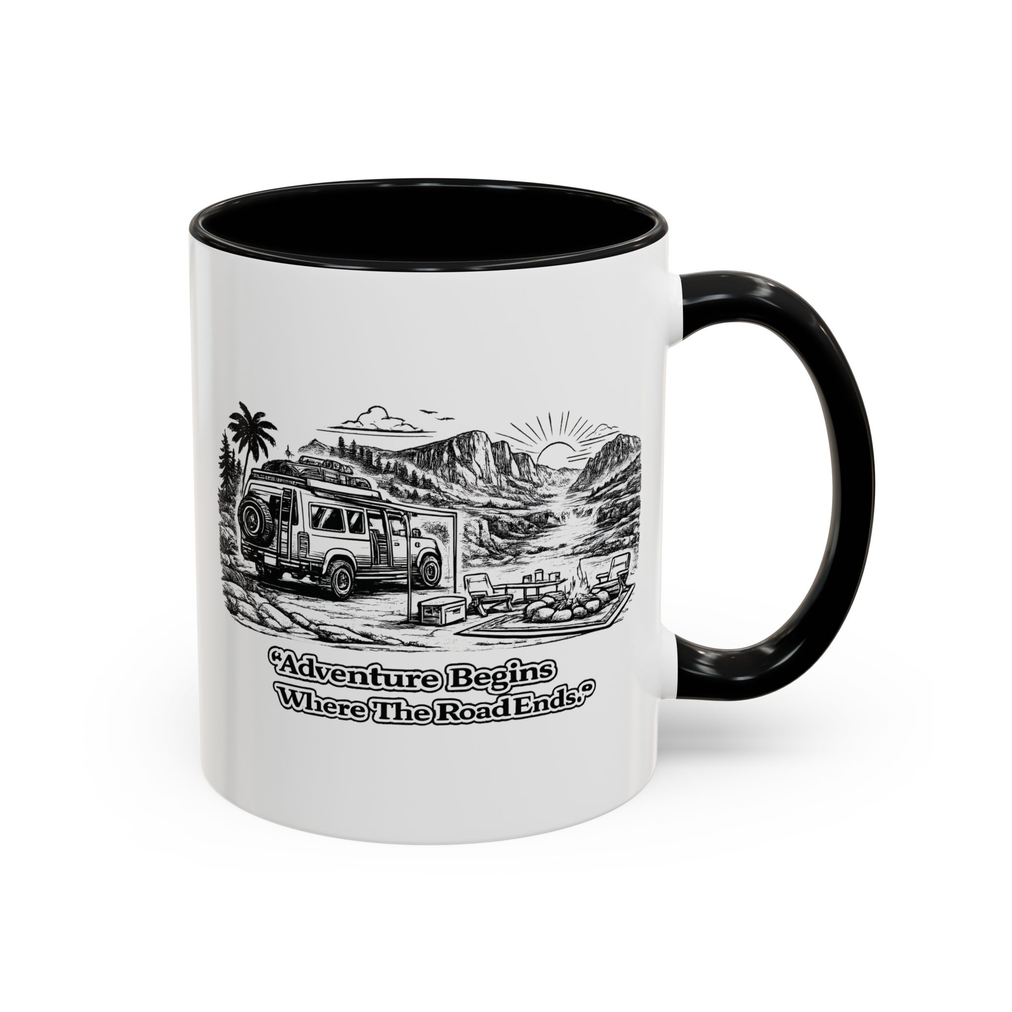 Accent Coffee Mug (11, 15oz) — “Adventure Begins Where The Road Ends” Design Minimal-Line