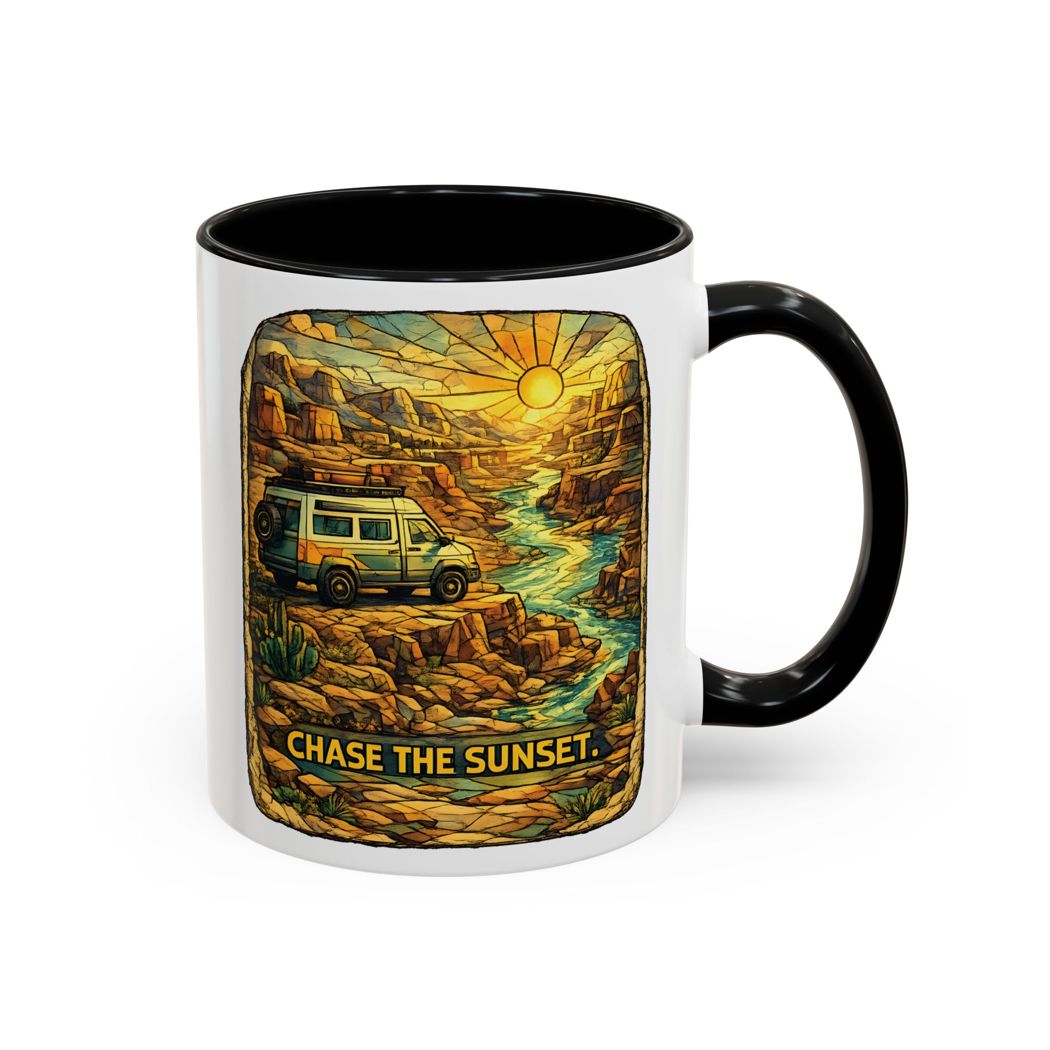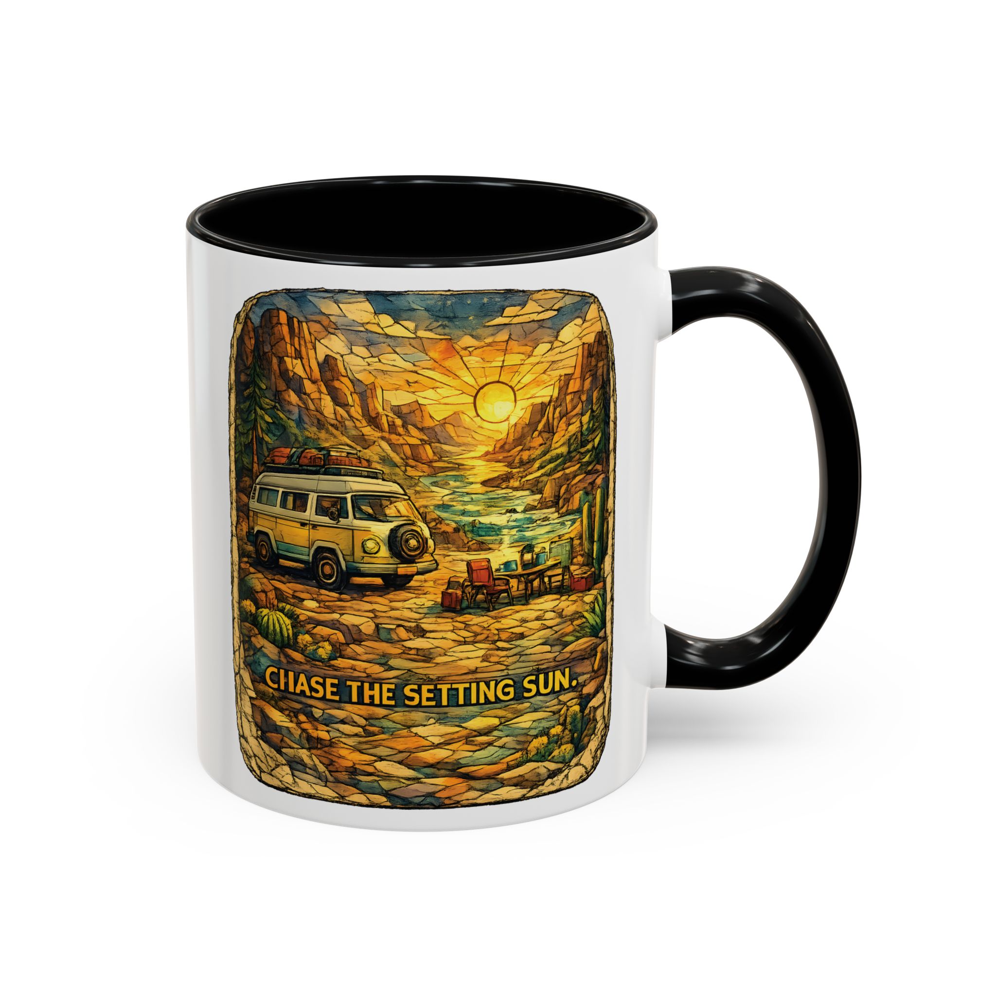 Accent Coffee Mug (11, 15oz) — “Chasing Sunsets And Dusty Trails” Design Sitcom-Line