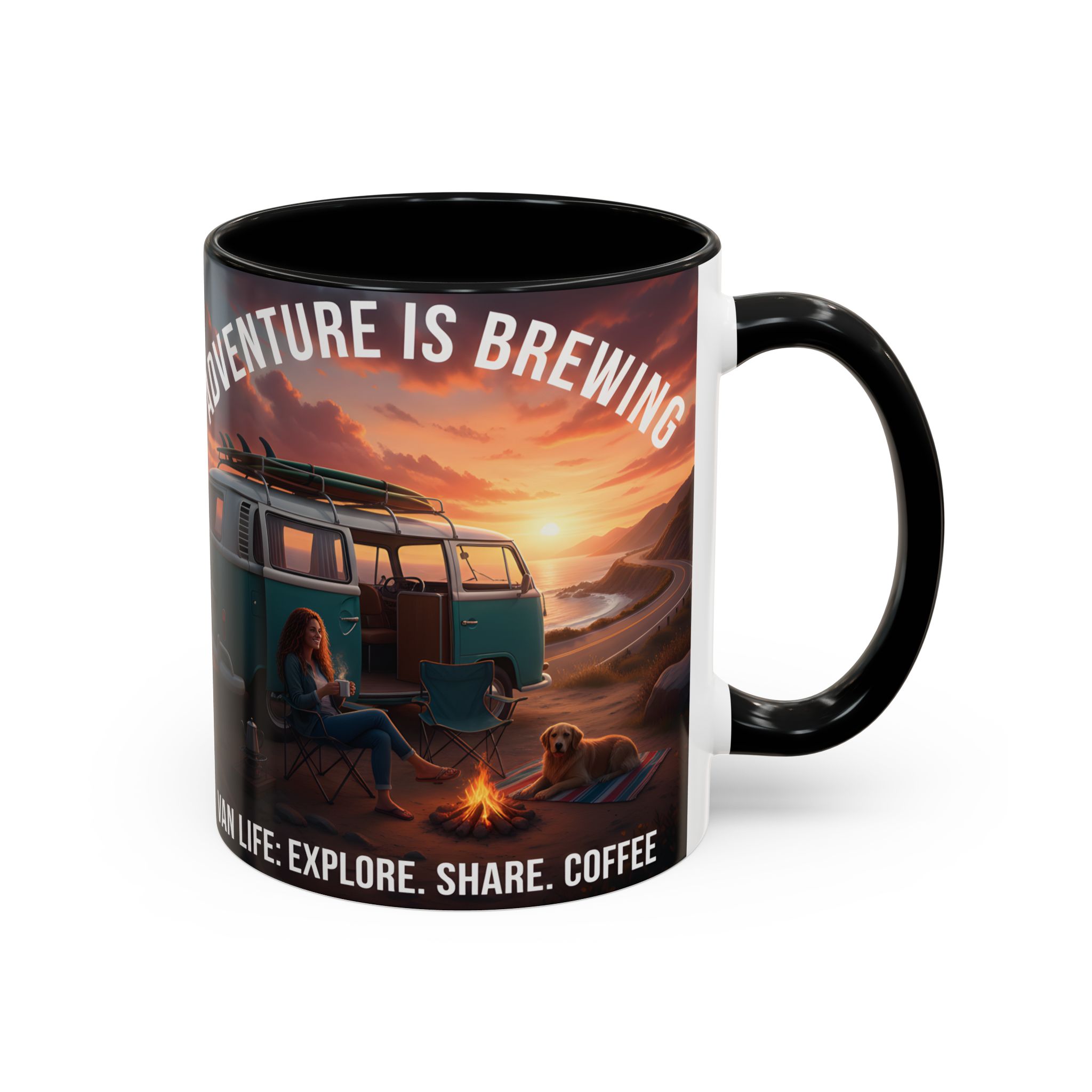 Accent Coffee Mug (11, 15oz) — “Adventure is brewing”