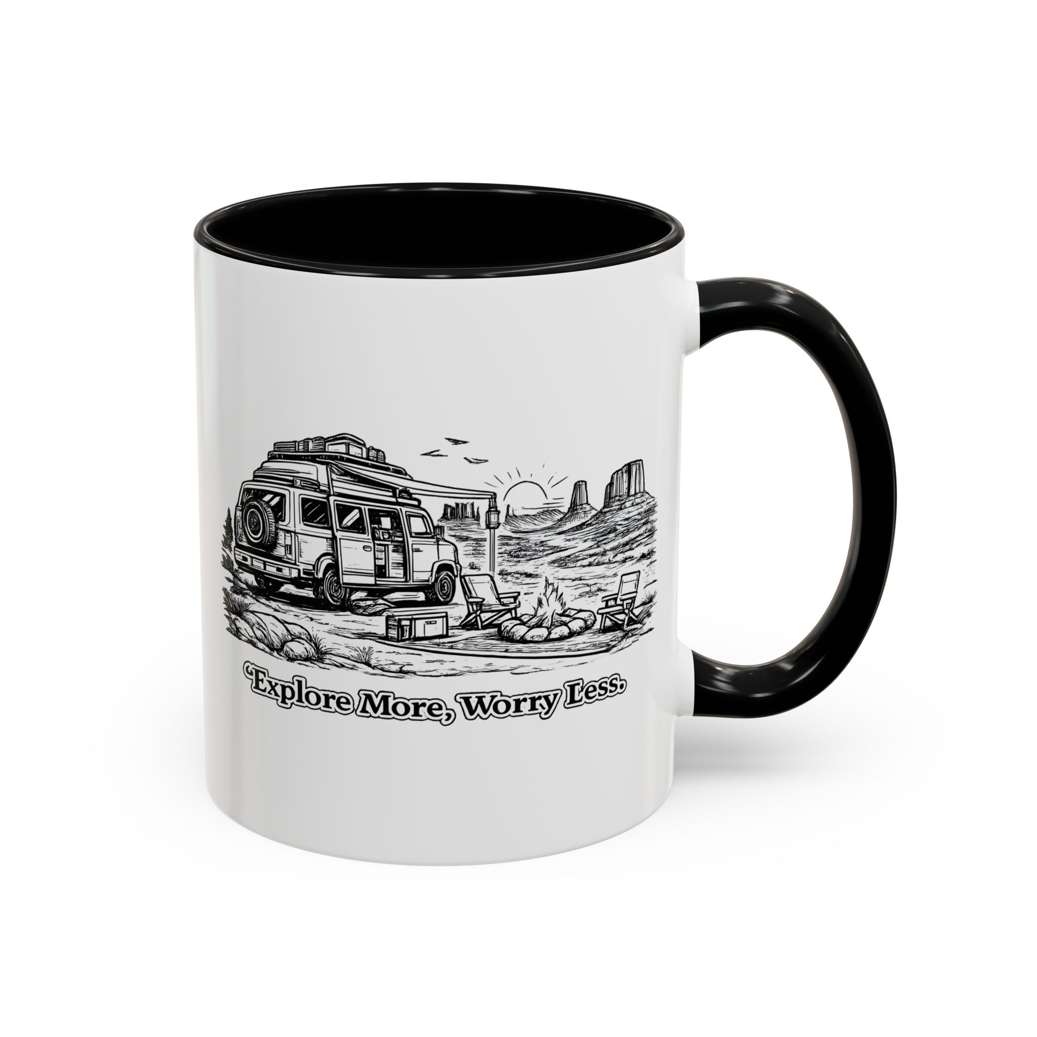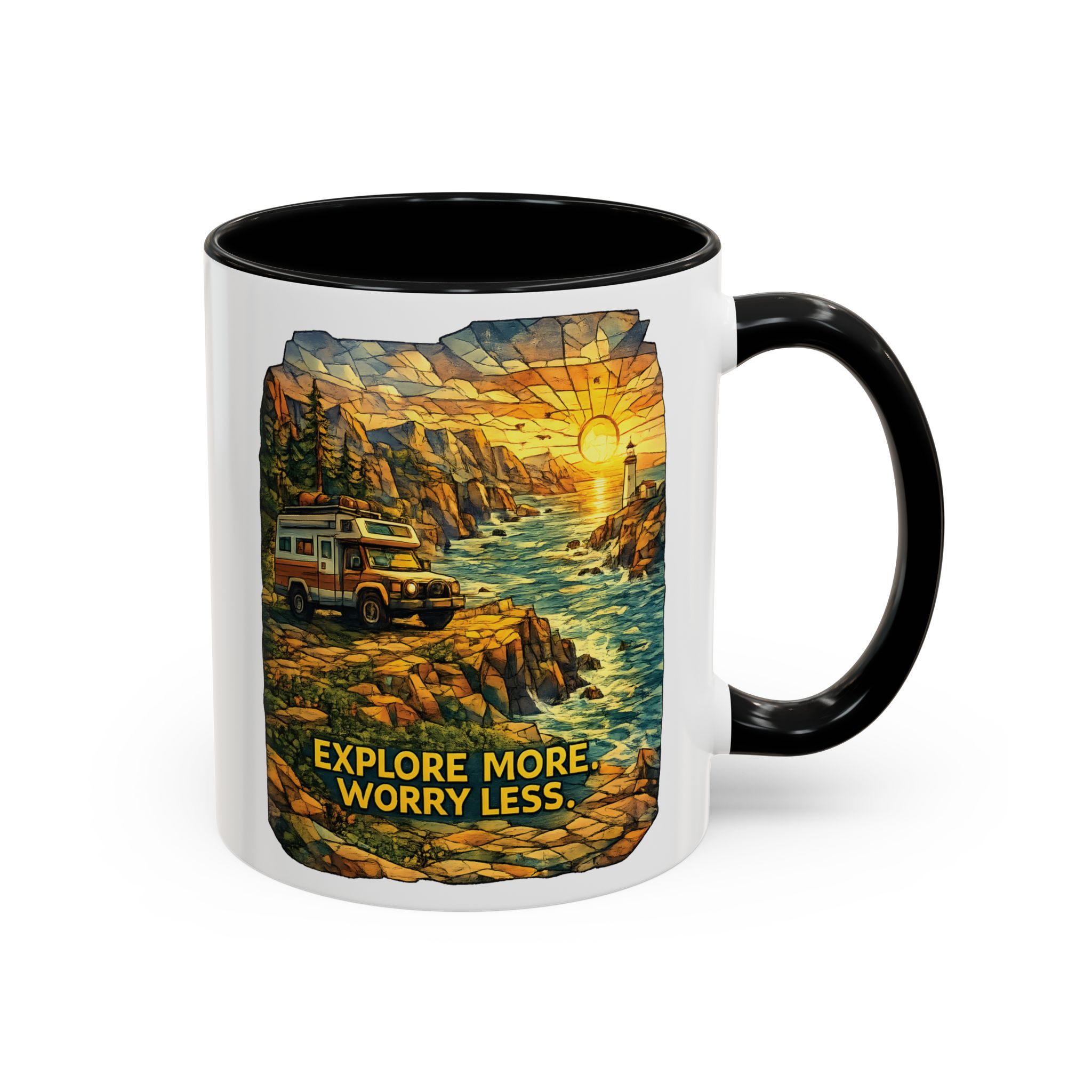 Accent Coffee Mug (11, 15oz) — “Explore More Worry Less” Design Minimal-Line