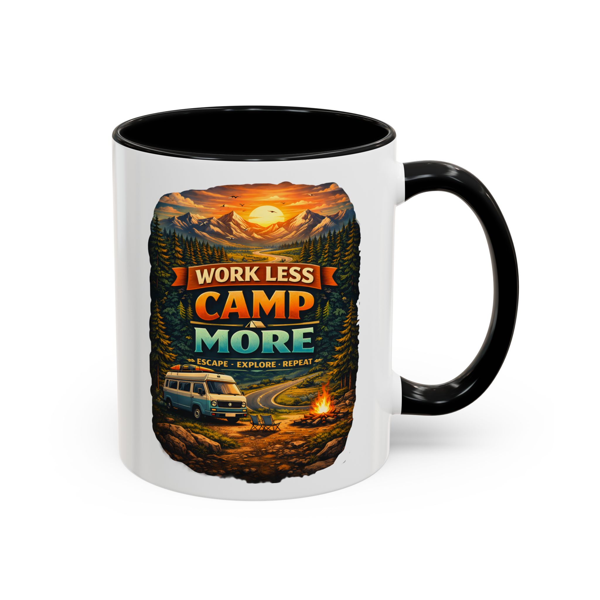 Accent Coffee Mug (11, 15oz) — “Work Less-Camp More” Design Scenic-Line