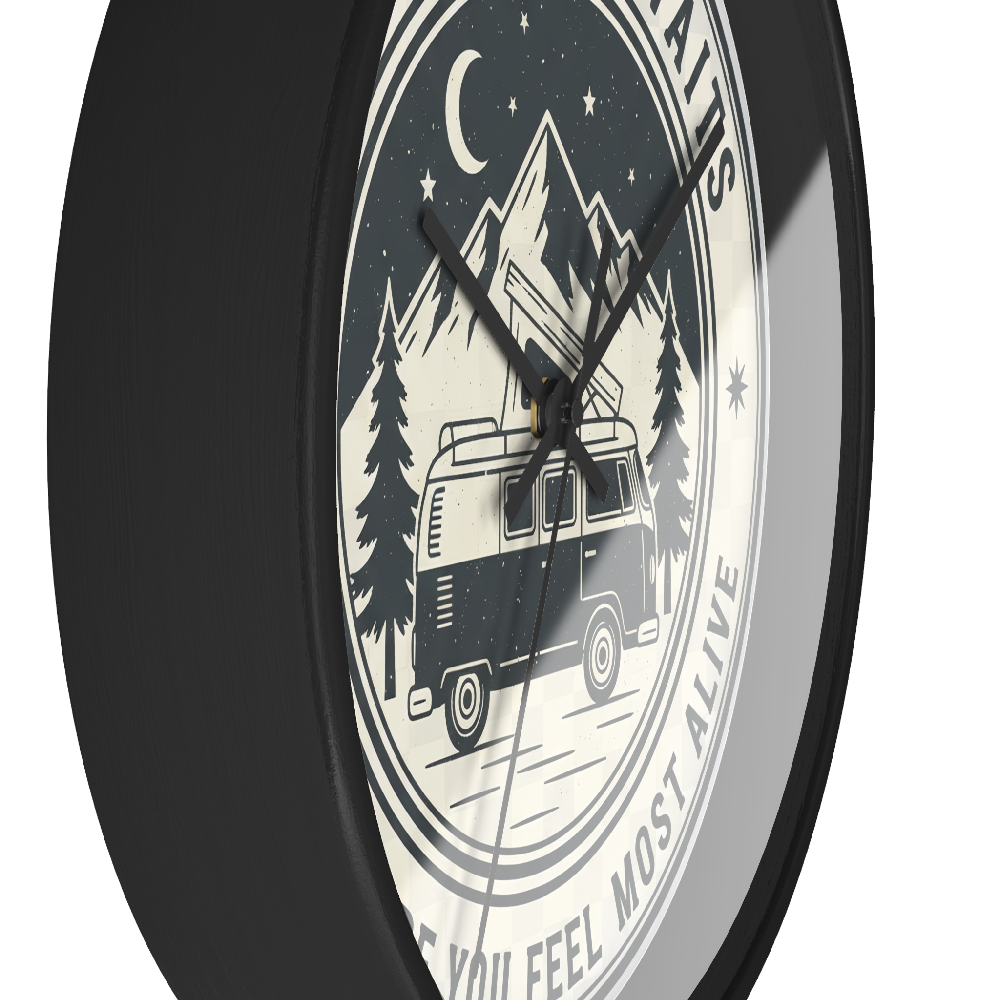 Wall Clock — “Adventure Awaits-Go Where You Feel Most Alive” Camper Van Mountain Travel Timepiece