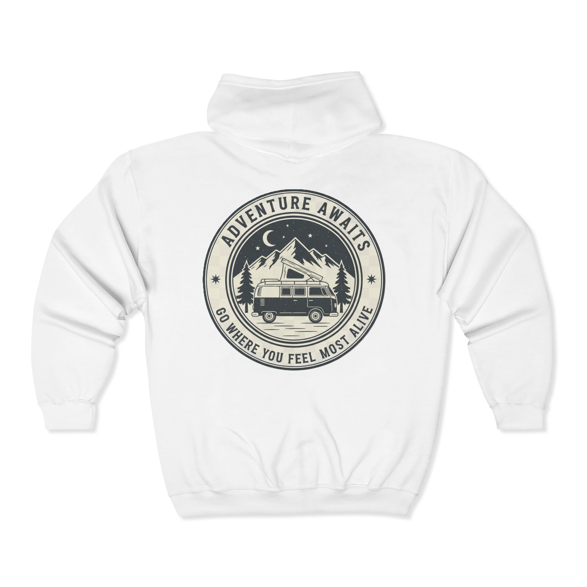 Zip Hoodie — “Adventure Awaits-Go Where You Feel Most Alive” (Front + Back Printed) Camper Van Adventure Zip-Up