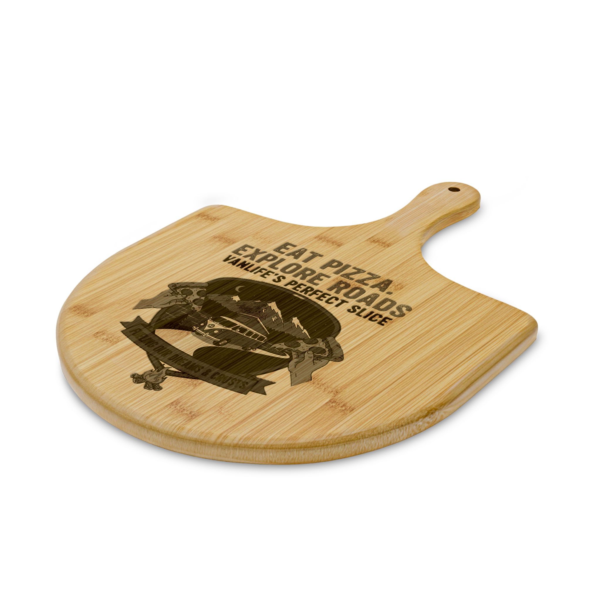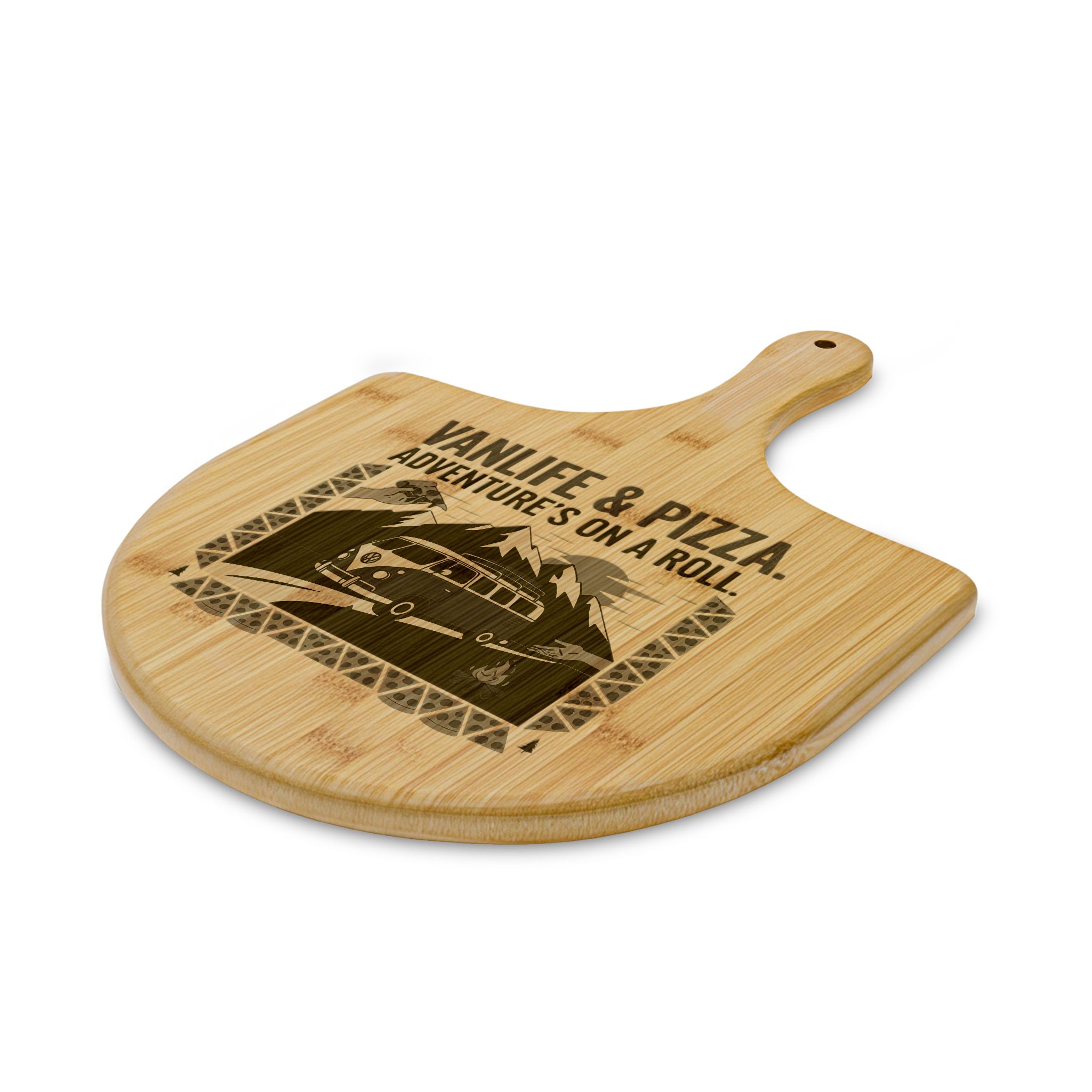 Bamboo Pizza Peel — Vanlife & Pizza Engraved Serving Board (“Adventure’s On A Roll”)